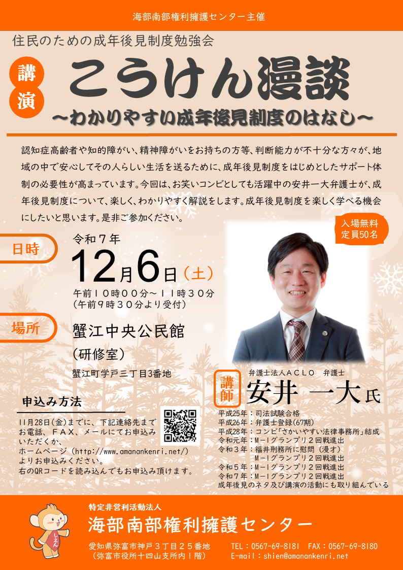 住民のための成年後見制度勉強会「『こうけん漫談』~わかりやすい成年後見制度のはなし~」を開催します(R7.12.6)